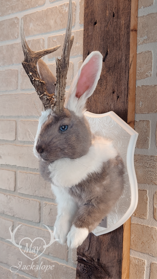 ''Lilac Magpie'' Harlequin jackalope taxidermy with blue eyes and real antlers