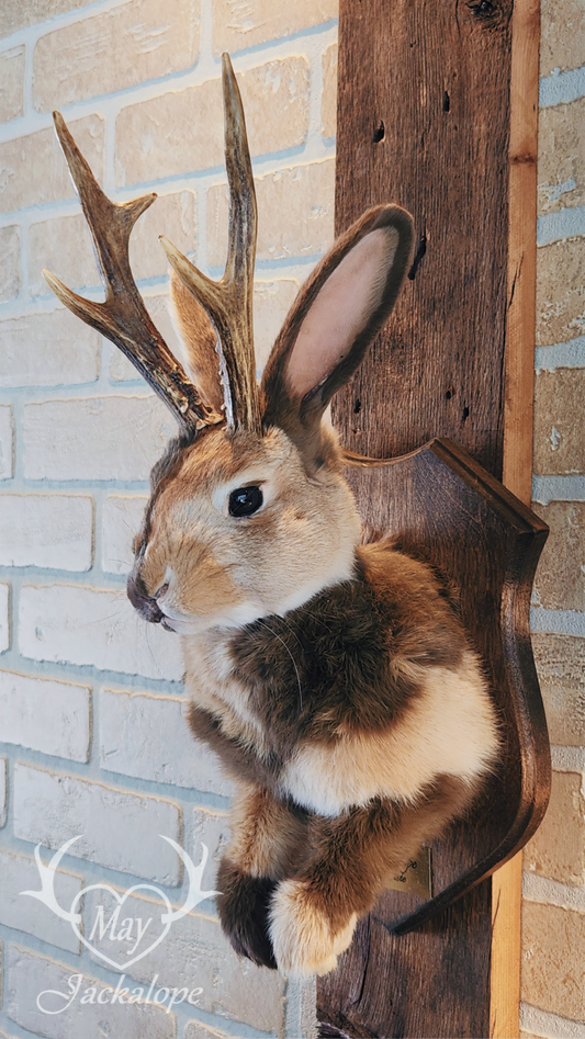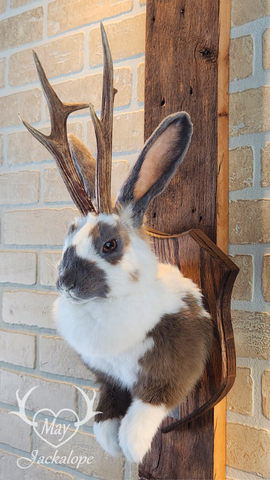 Tricolored tuxedo jackalope taxidermy with hazel eyes and real antlers