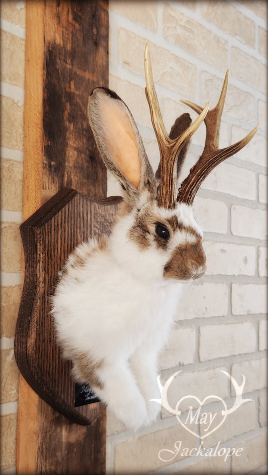 Taxidermie d'un jackalope blanc et brun, aux yeux foncés avec vrai bois