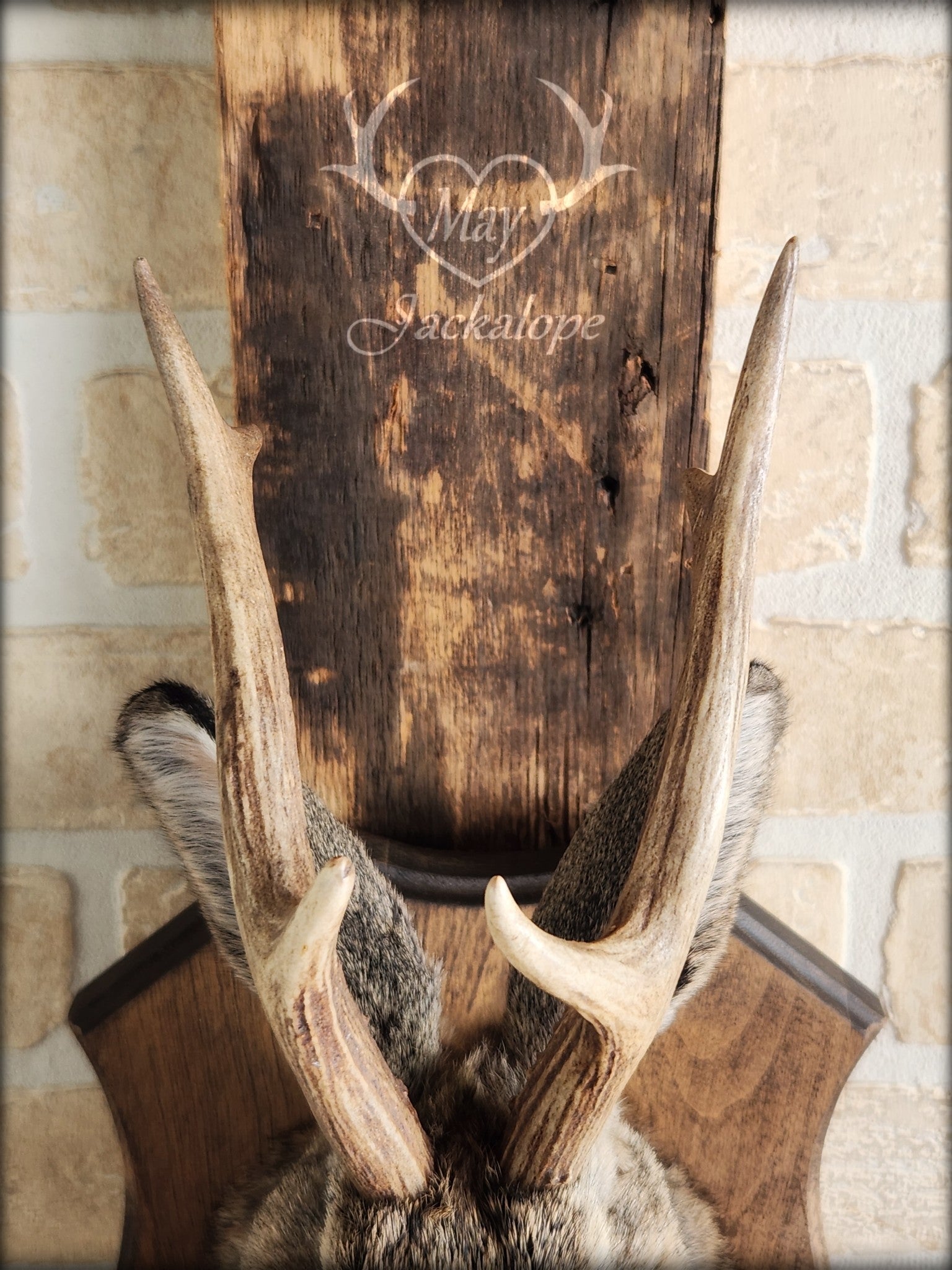 Vous recevrez exactement le jackalope que vous voyez sur ces photos. Le panache est un vrai d'un chevreuil européen (non répertorié CITES)