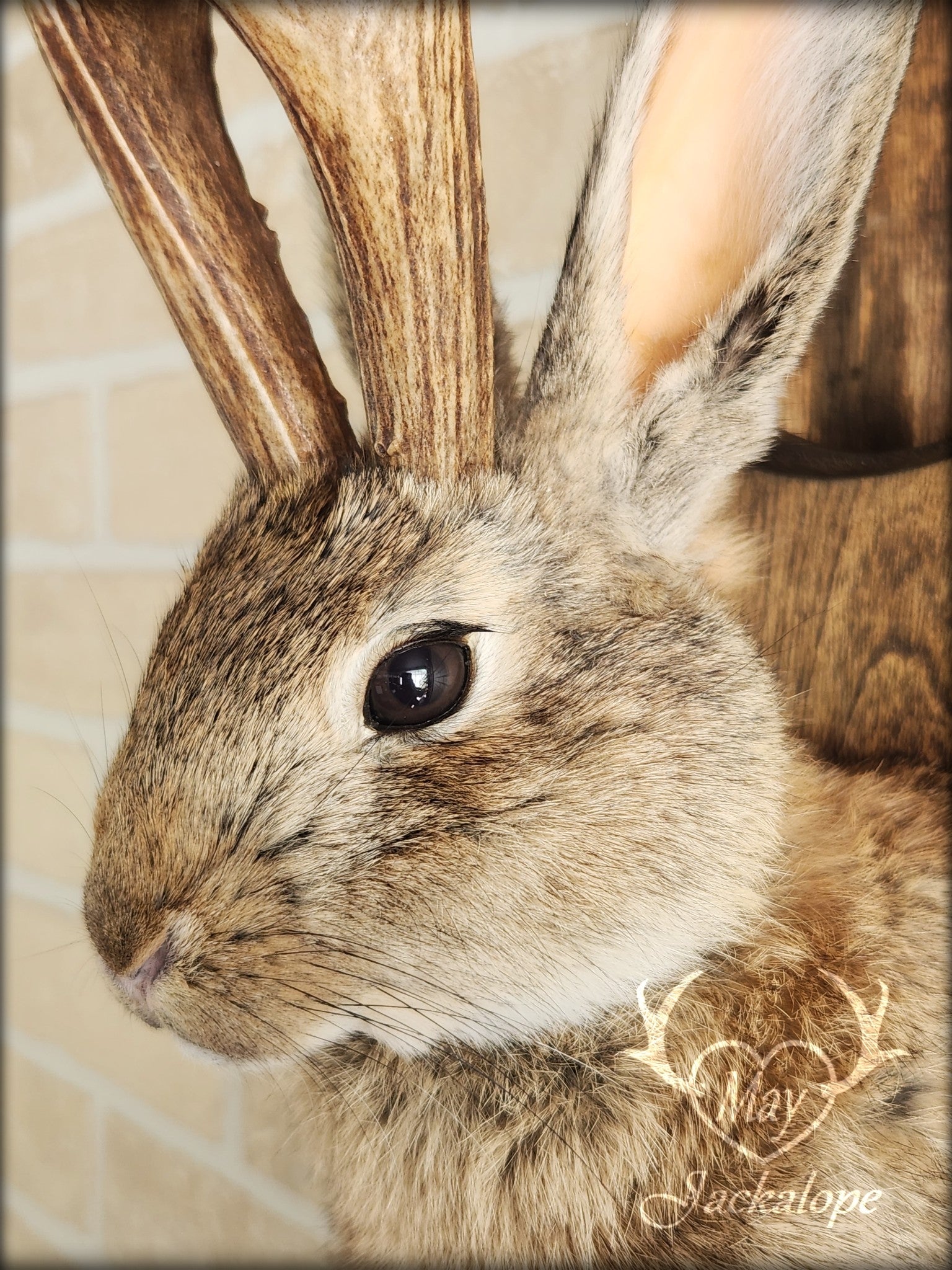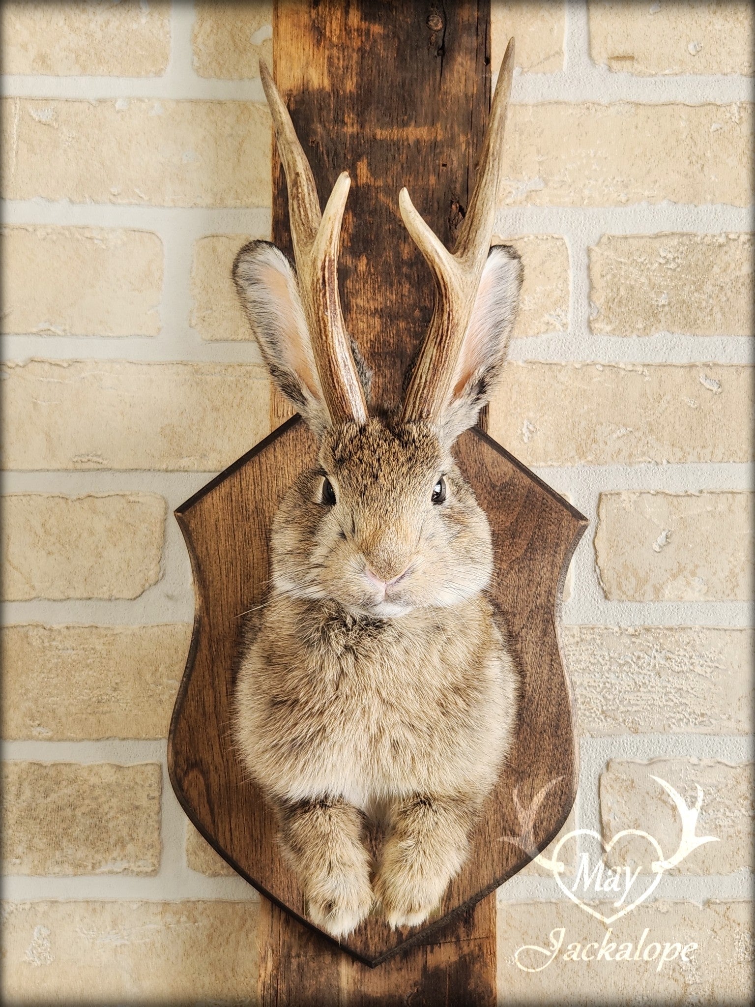 Taxidermie d'un vrai lapin transformé en magnifique jackalope. Ce jackalope est unique, fabriqué avec soin et attention aux détails. La fourrure est tannée professionnellement pour durer toute une vie.