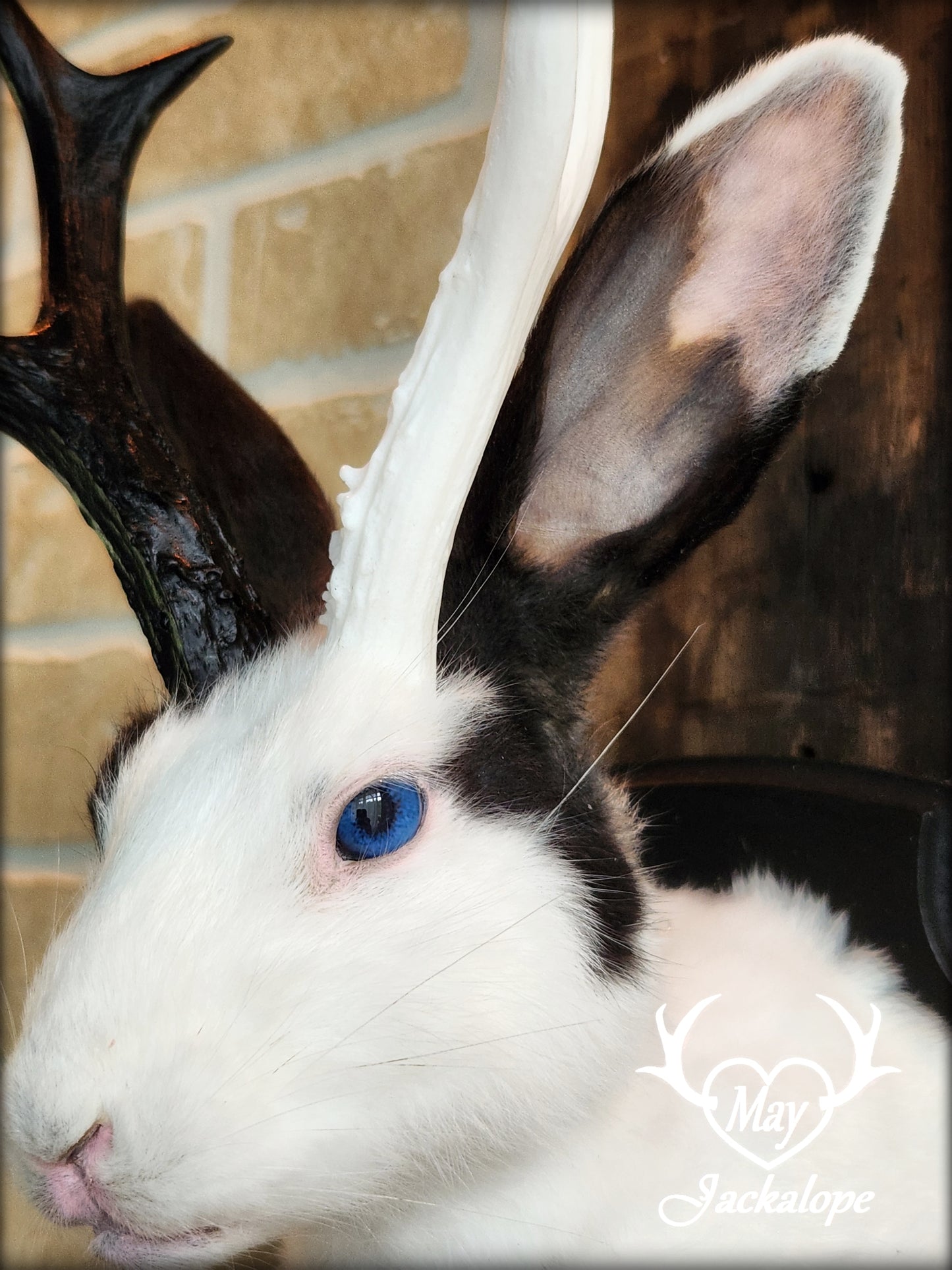Véritable taxidermie de lapin transformé en magnifique jackalope. Ce jackalope est unique, fabriqué avec soin et attention aux détails.