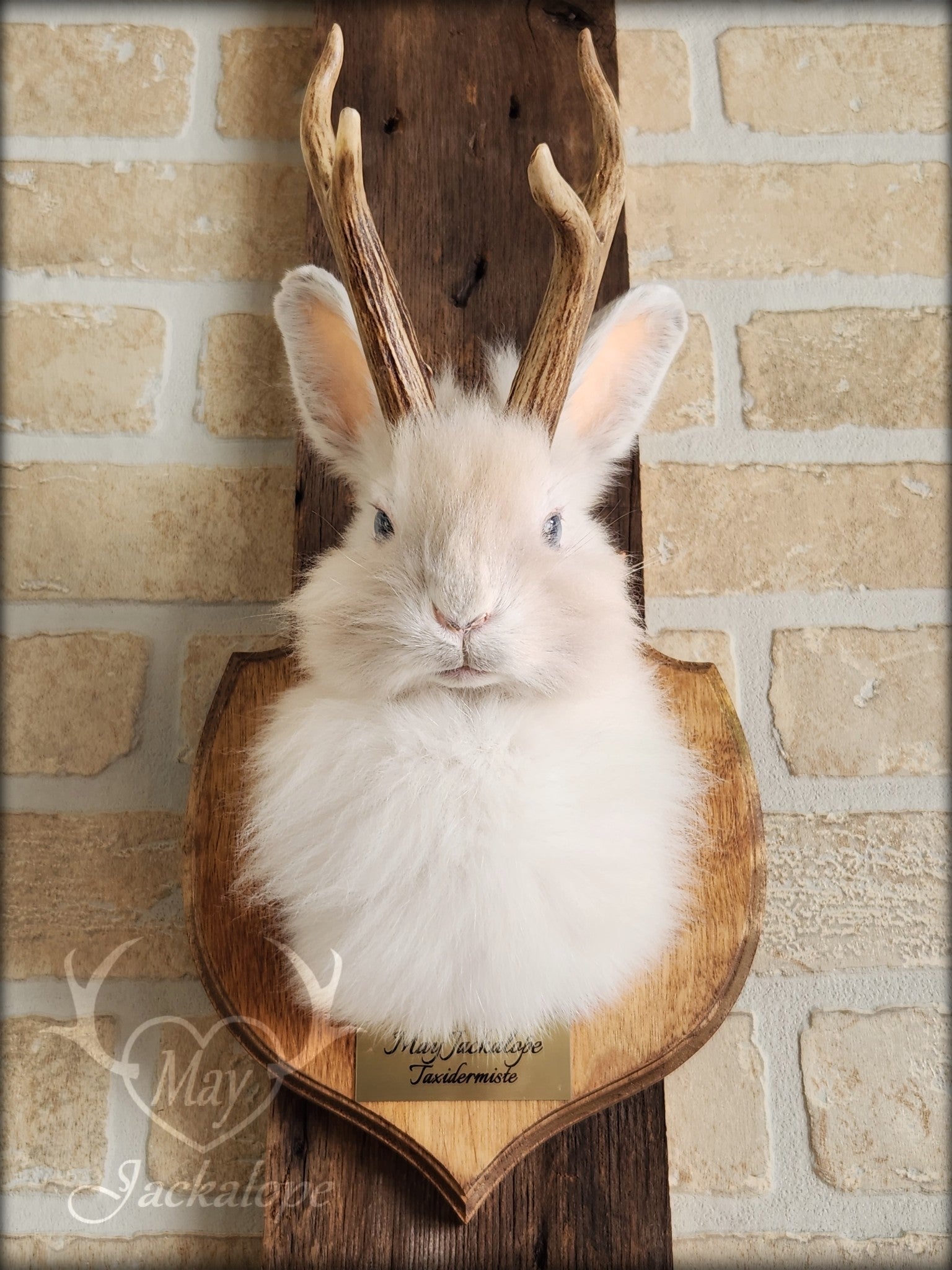 Real rabbit taxidermy transformed into magnificent jackalope. This jackalope is unique, made with care and attention to detail. The fur is professionally tanned to last a lifetime.
