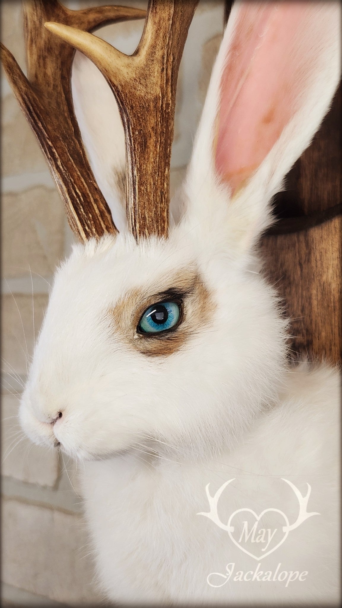 White and light brown jackalope taxidermy with teal eyes & real antlers